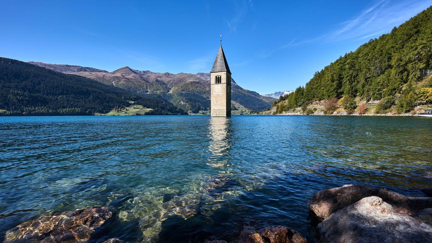 From the church of Graun, built in 1355, only the Romanesque tower remains. The village was sunk in 1950 to create a reservoir. The tower, now a historical monument, is called "Kirchturm im Reschensee" in German, and "Campanile nel Lago di Resia" in Italian. The monument has become a tourist site, attracting many people to the shores of the lake and presenting one of the last Netflix horror shows: Curon.