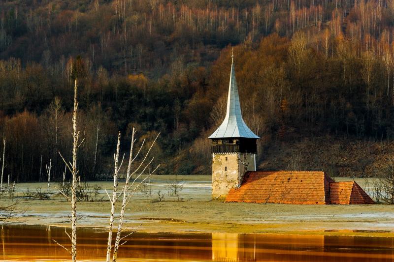The church of Geamăna was built in the first half of the 18th century and is decorated with paintings inside. Today, only the church tower is visible. The village of Geamăna lies 100 metres below the surface of a lake which contains the highly toxic ore dumps of the copper mine of Roșia Poieni, active since 1977.
