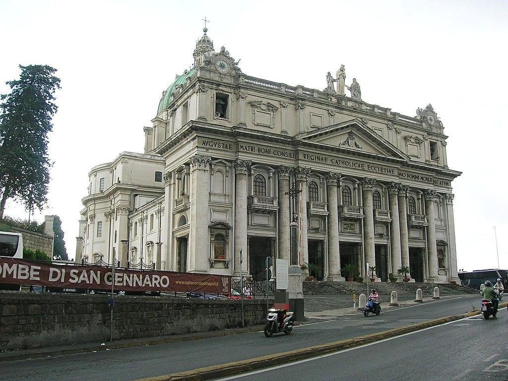 The Basilica dell'Incoronata Madre del Buon Consiglio is a Roman Catholic church on a hill . The church was built between 1920 and 1940, on top of the Catacombs of San Gennaro.