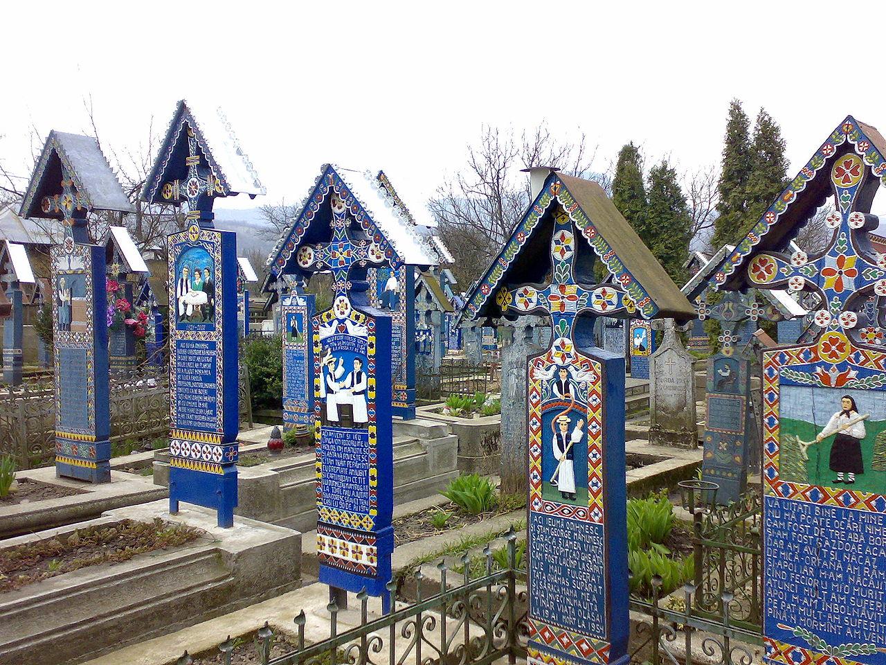 The Merry Cemetery is a cemetery in the north of Romania famous for its colourful hand-painted wooden crosses, each with a painting and a poem in memory of the person buried below.