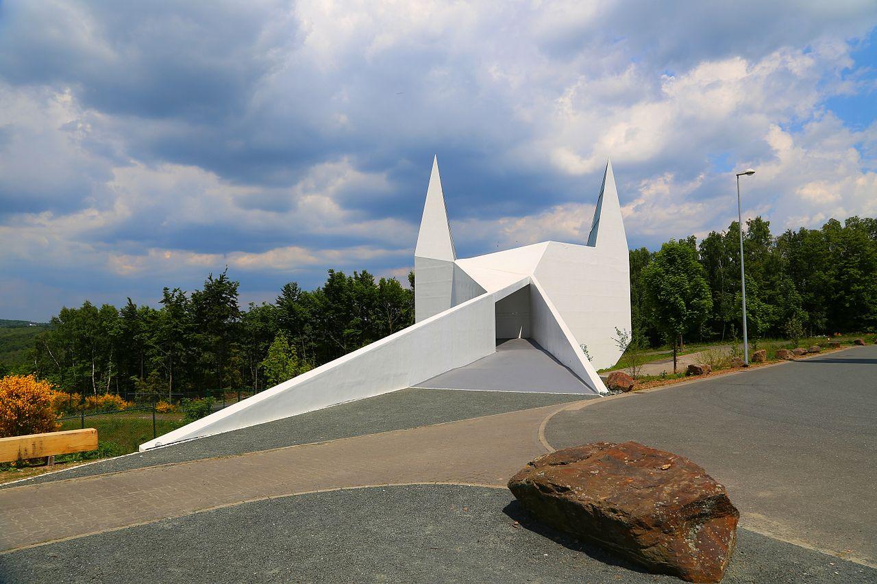 The Siegerland motorway church, located on the B45, was inaugurated on 26 May 2013. The building, a multi-award-winning design by Frankfurt architects Schneider + Schumacher, is an example of post-modern religious architecture. The design of the church exterior is based on geometric triangular shapes. In the entrance area of the church, there is a typographic installation by Peter Zizka.