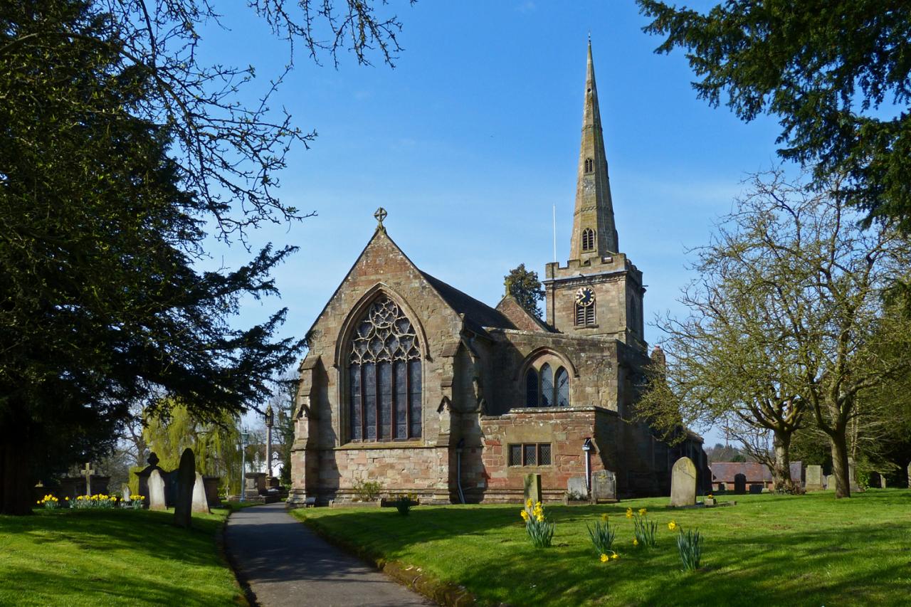 The church situated in an elevated position with superb views of Shropshire and is surrounded by mature beech and Spanish chestnut trees. On early spring days the churchyard is carpeted with snowdrops and then daffodils.