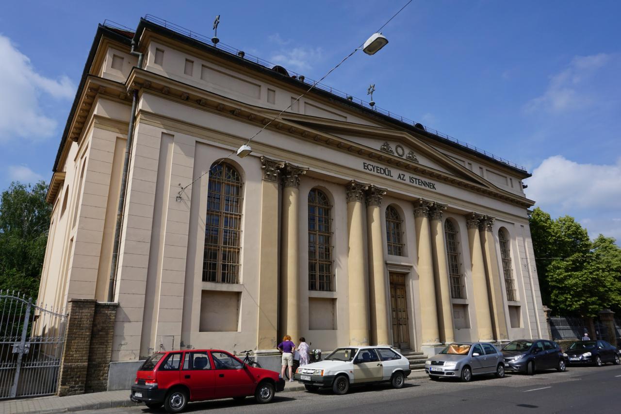 The synagogue, designed by the Christian architect Lajos Frey, is a magnificent Neo-Classicist building erected in 1842-45. Its western (entrance) and northern (street) façades are decorated by Corinthian porticos. The interior is spanned with sail vaults and was richly painted, probably in the late nineteenth or early twentieth century. In 1980 the building was converted into a library, but its interior was almost completely preserved.